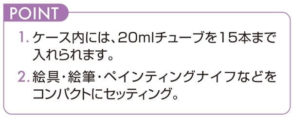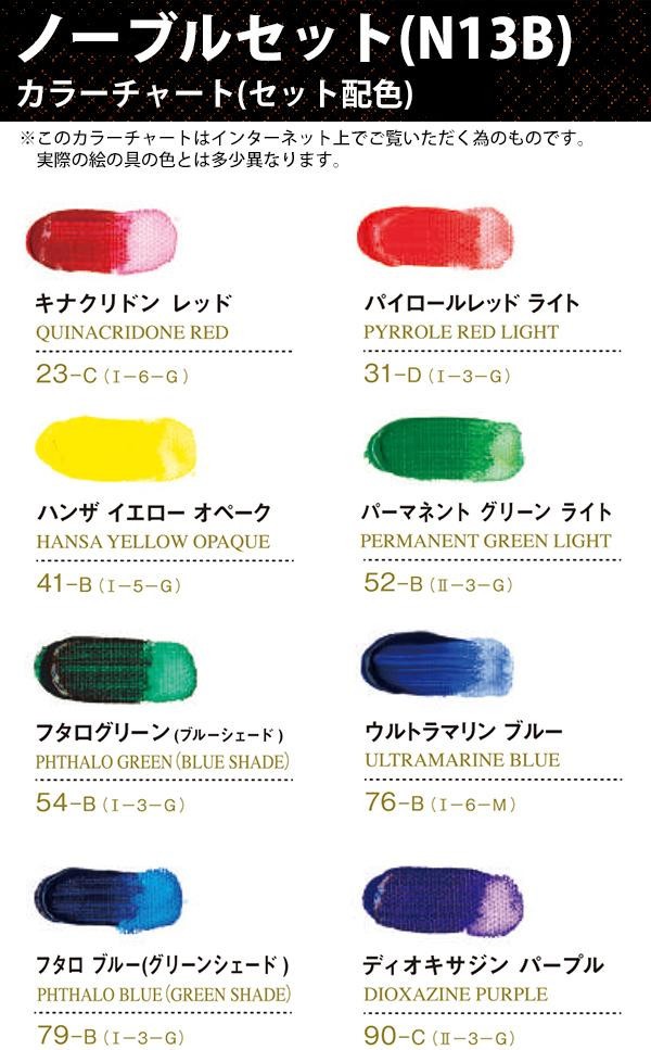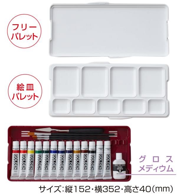 | セット内容 | Wパレット付ケース、ナイロン筆(平6・12・丸4号)×各1、グロスメディウム(25ml)、ペインティングナイフ 【絵具】 20ml×13本(12色/うちホワイト2本入り) |