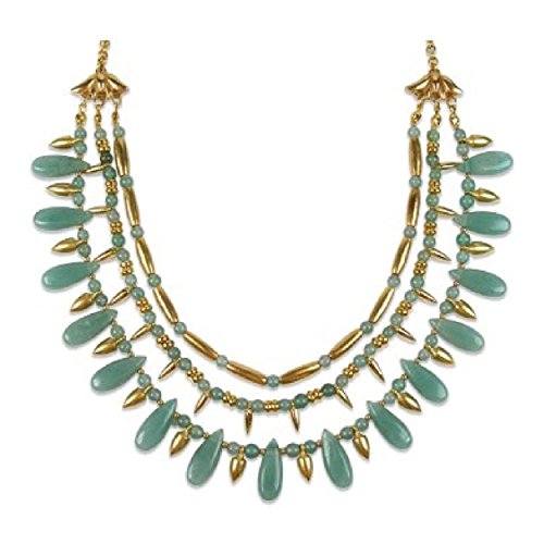 Sparkly green aventurine with granulated tubular and spiked beads in a gold-finish bring a fun splash of color to a chic necklace strung in three layers with a Cleopatra style lotus designed clasp with toggle closure. The bib drop is approximately 2 inches. Twenty (20) inch length with toggle and bar closure. Fifteen 15mm by 5mm teardrop stones, Seventy-nine 2mm round stones.