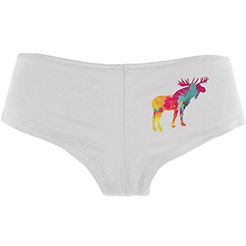 Product Description This original Animal World design of a splatter paint moose is printed on the back right side of a pair of soft cotton/spandex blend, cheekie booty shorts. 0