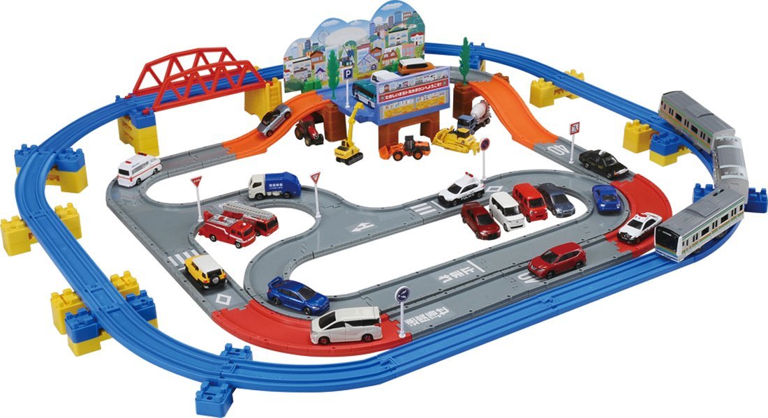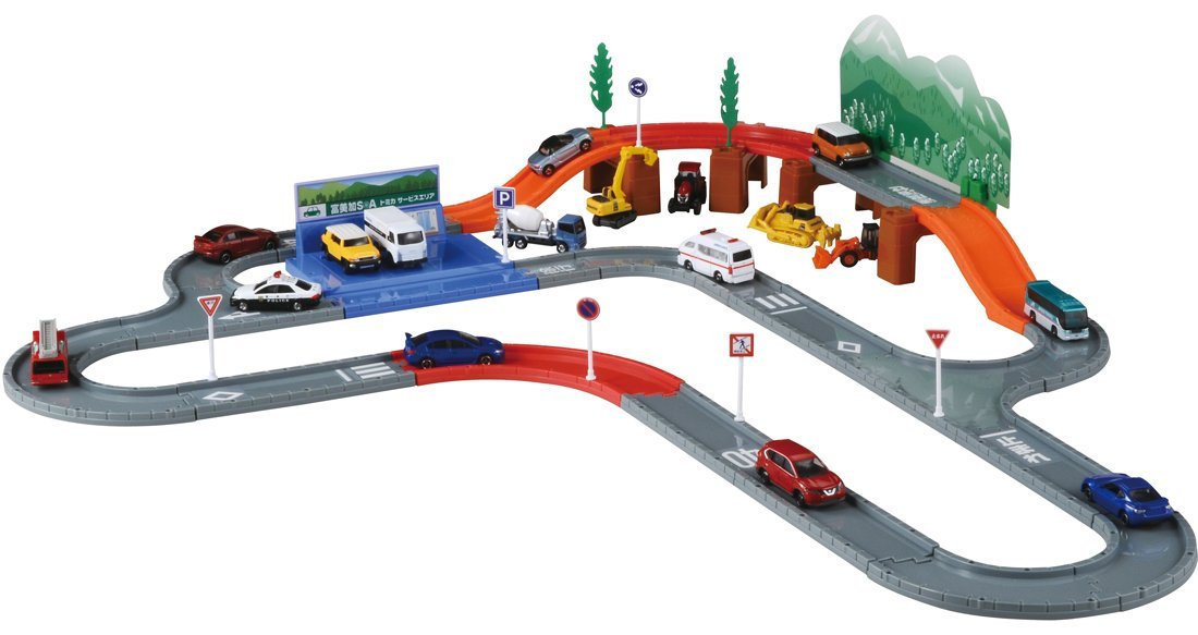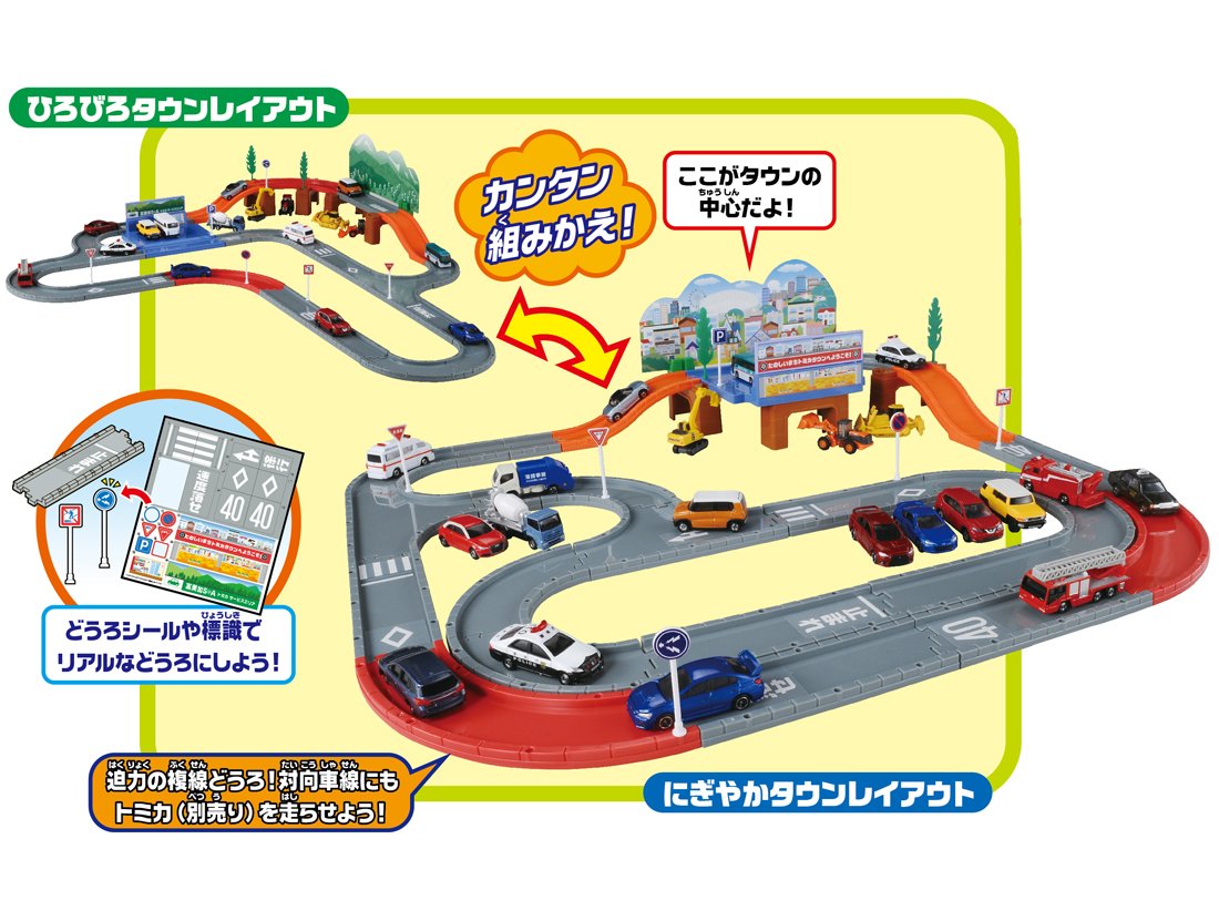 両面印刷の山と街のイメージボードをセットでき、人気の平面タイプの道路が豊富でレイアウトも組みやすく、交通標識や道路の標示シールも付属し、トミカシステムの入門用としても最適です。