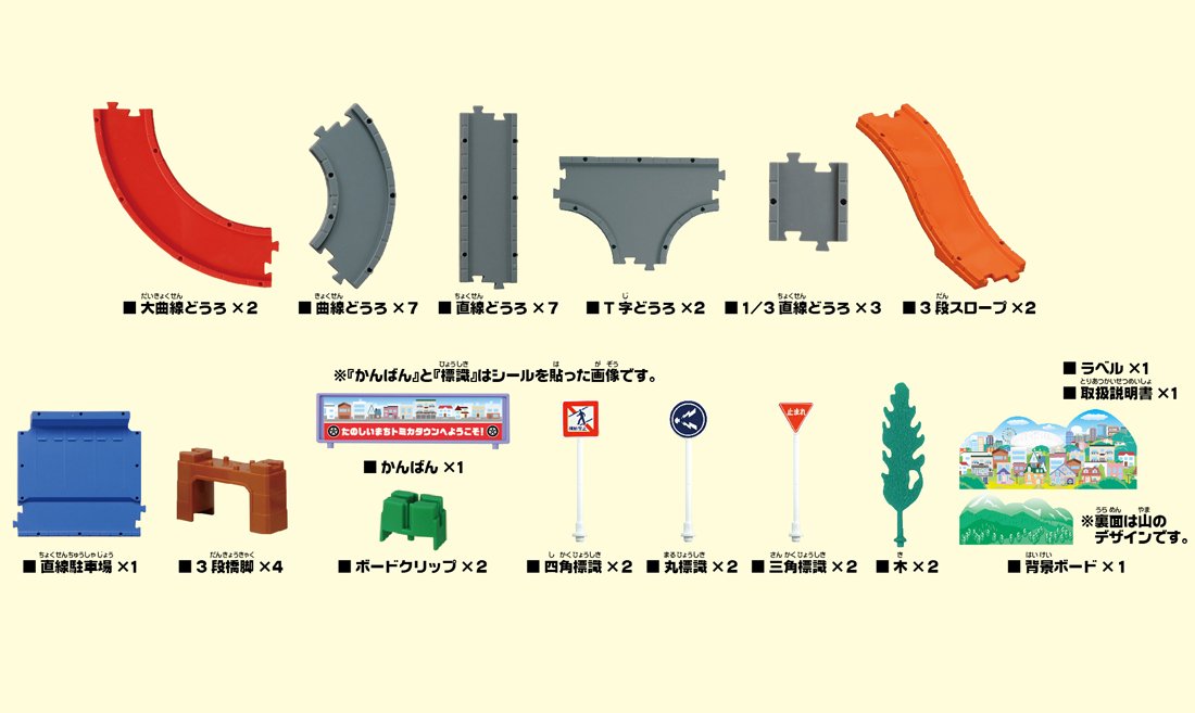 [セット内容]直線道路(7),曲線道路(7),T字道路(2),直線駐車場(1),3段橋脚(4),3段スロープ(2),ボードクリップ(2),木(2),大曲線道路(2),1/3直線道路(3),看板(1),紙ボード(両面印刷)(1),標識パーツ(丸)(2),標識パーツ(三角)(2),標識パーツ(四角)(2)