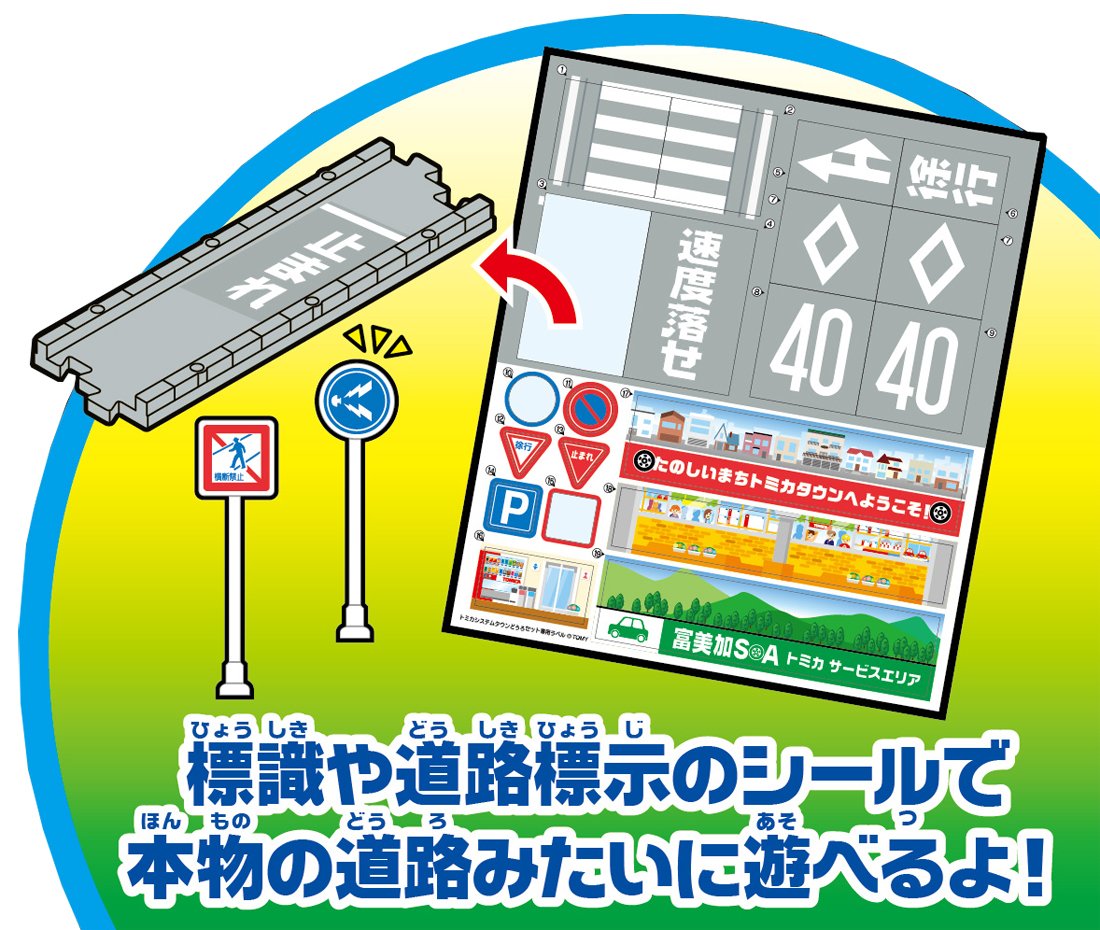 標識パーツ、道路にはるシールが付属。トミカのごっこ遊びがさらに楽しくなります。