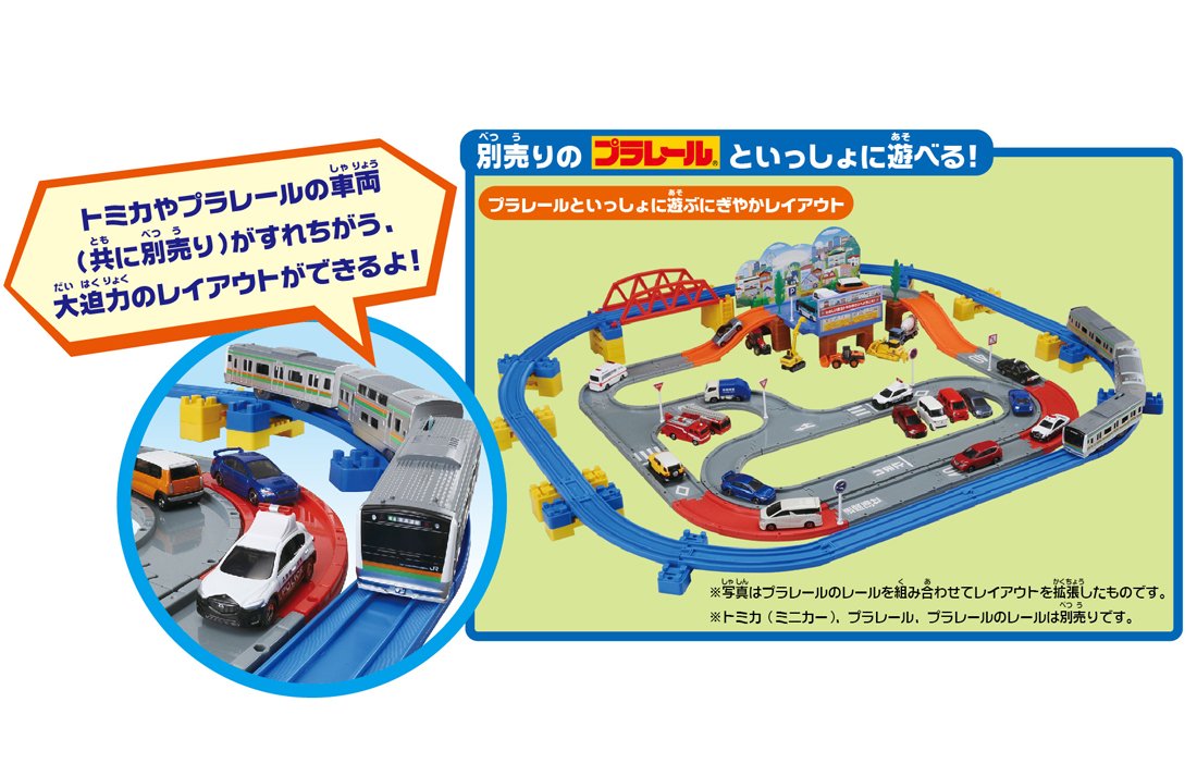 複線道路の特長を使い『チャージトミカ』(別売り)を自動周回させながら複線の外側道路でトミカを手転がしで遊べ、今まで以上に臨場感のあるトミカ遊びが可能です。