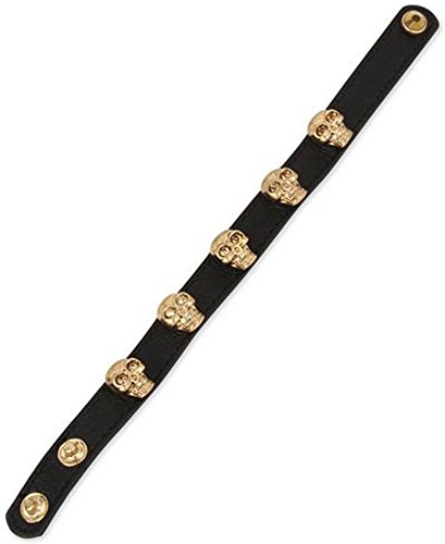 -. Feature : From the "Skeletons After Dark" Collection by Betsey Johnson. / Chic bracelet studded with glistering crystal trimmed skulls. / Goldtone metal skulls on a black leather band. / Snap closure. / Approximate length: 6-3/4" to 7-1/2".