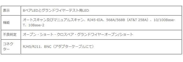 | LANケーブルのオープン、ショート、リバース、スプリットペアクロスなどの結線不良・良否判定をします。 |
