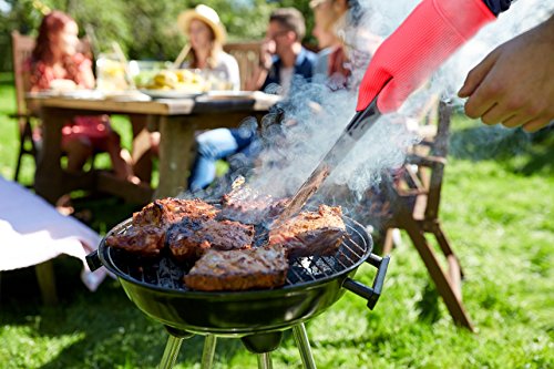 ✔️LONG, SAFE NON SLIP HANDLES - Each grilling utensil has an elongated handle to keeps you as far away as possible from the heat of the grill or oven when you are cooking. These handles are made of thermoplastic rubber material that ensures a good grip and that they will not fall out of your hands. In addition each handle has a ring at the tip that allows you to hang it up or store it easily.