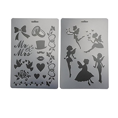 Package includes 6 painting stencils of 6 different patterns, butterfly, fairy, flower and bird, grape and leaves, flower, and wedding themed patterns.