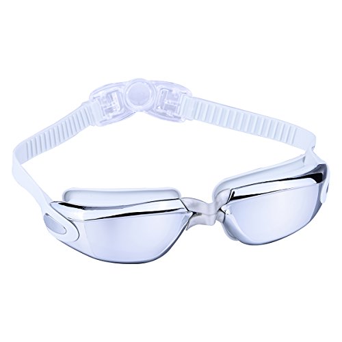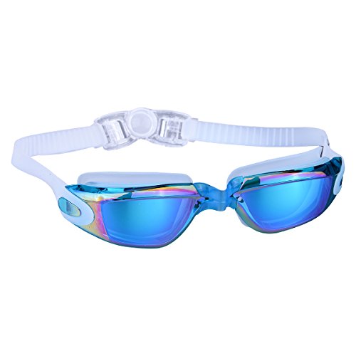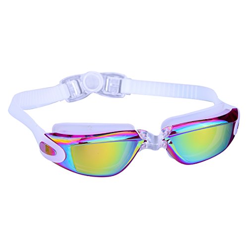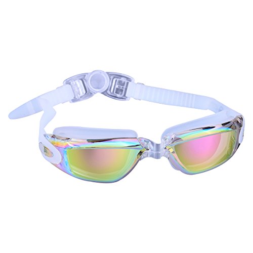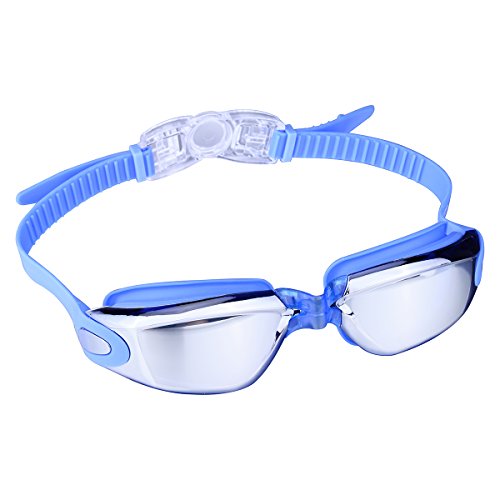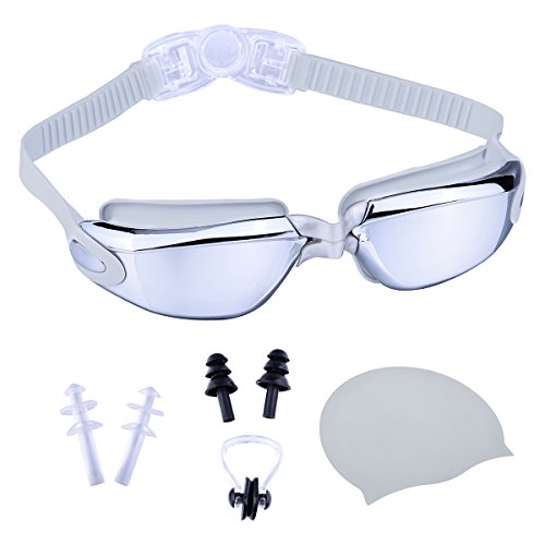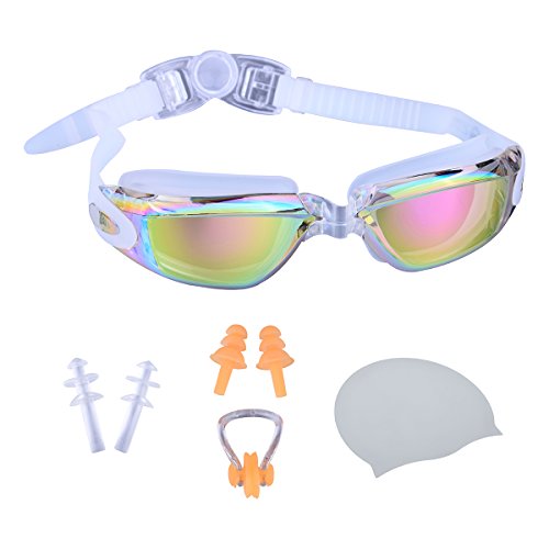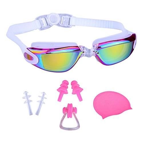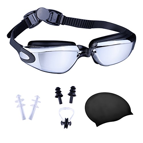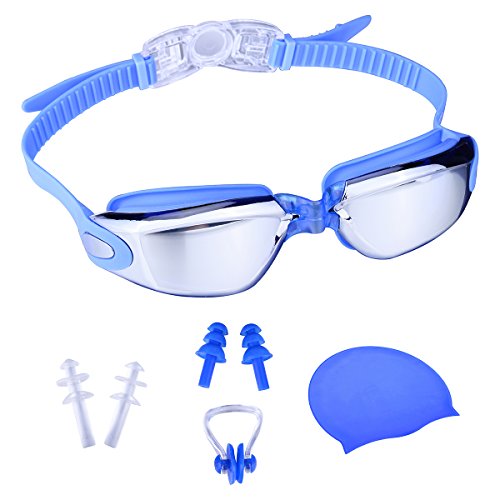 Fertures: -Size: Width of Lens: 3.5cm;Length of Nose Bridge: 2.6cm; Length of Frame: 17.5cm; Goggles Straps perimeter:38.5cm; Swim Cap width: 22.5cm, height: 14cm. -Six Color: Blue/Black/Lack Blue/Gray/Pink/Transparent. -UV Protection--The Swim Goggles' outer surfaces of the lenses are carefully coated which enables the lenses to filter harmful rays and protect your eyes from heat and damage of the sunrays, especially when you swim outdoors. -Waterproof HD and Anti-Fog. The inner surfaces of the lenses are anti-fog coating, enhance the clear of view. -Waterproof Earplugs--Super-soft silicone protect our ear. Silicone Swim Cap--Lightweight silicone provides durable performance and optimum fit without snagging hair. -No leaking--Premium silicone material and Ergonomic design used on the swim goggles ensure a snug fit on different facial forms and never allows water leak in. Do not drop goggles on hard surfaces.