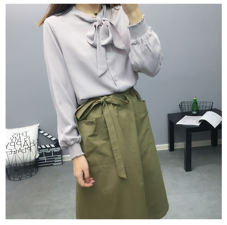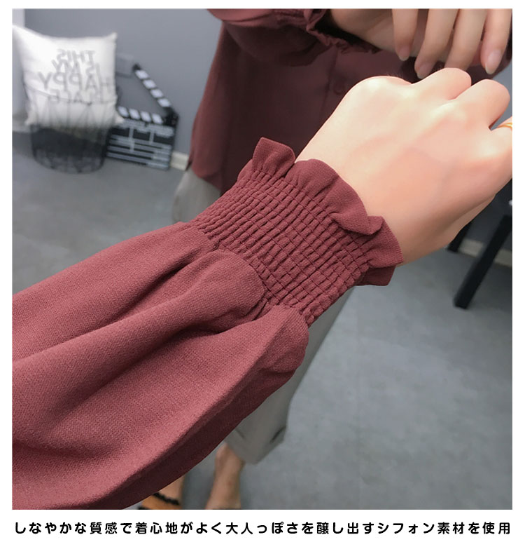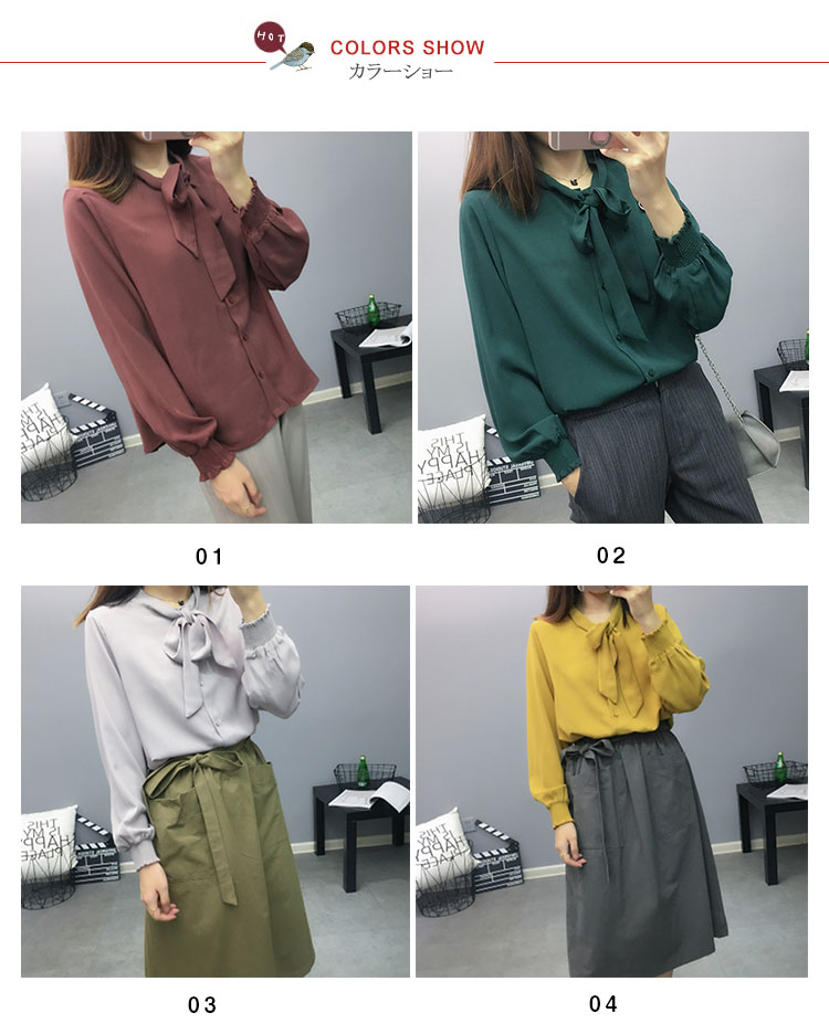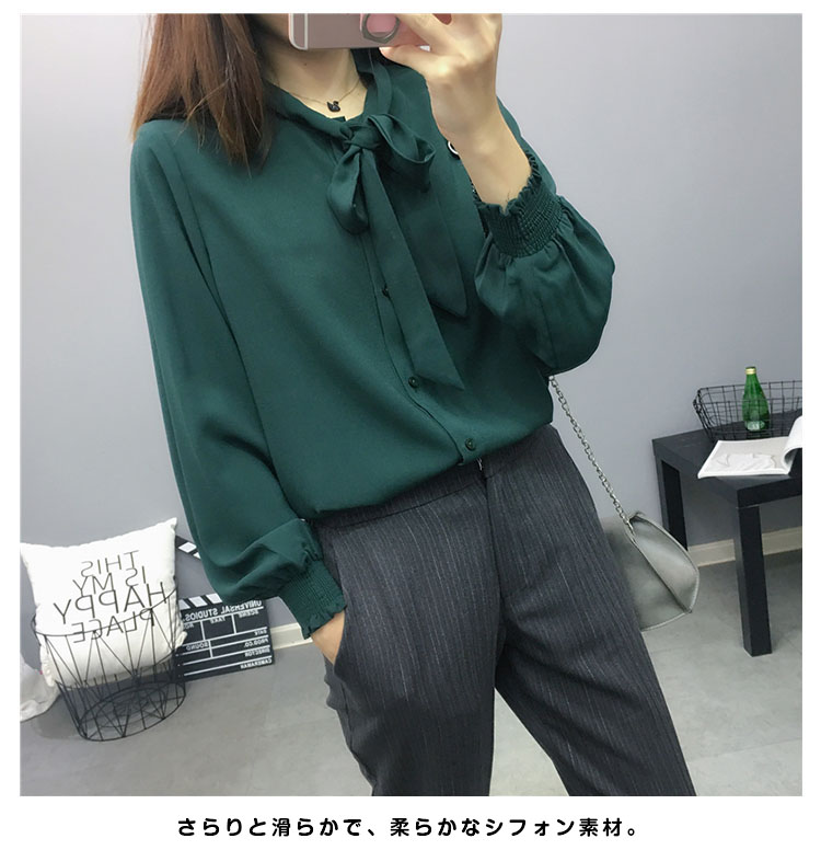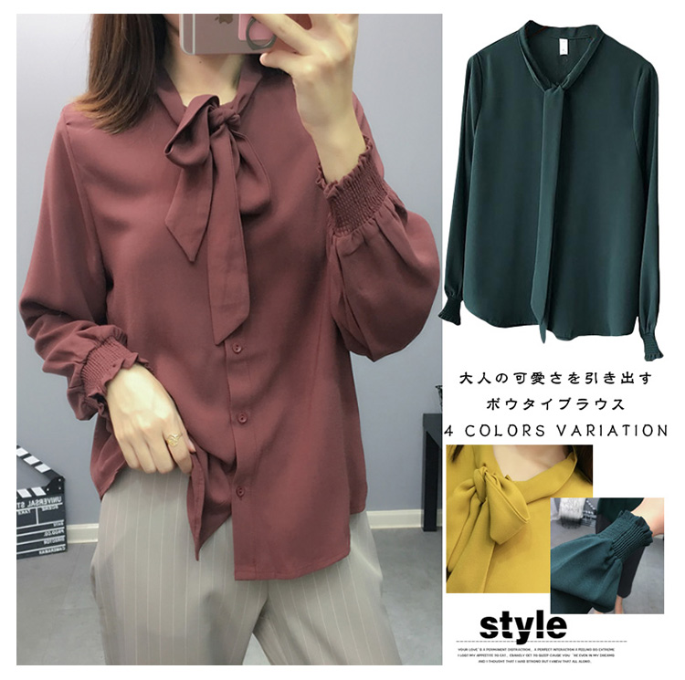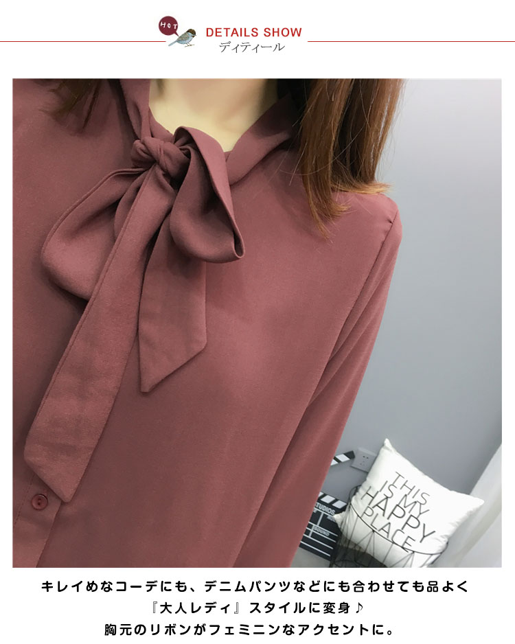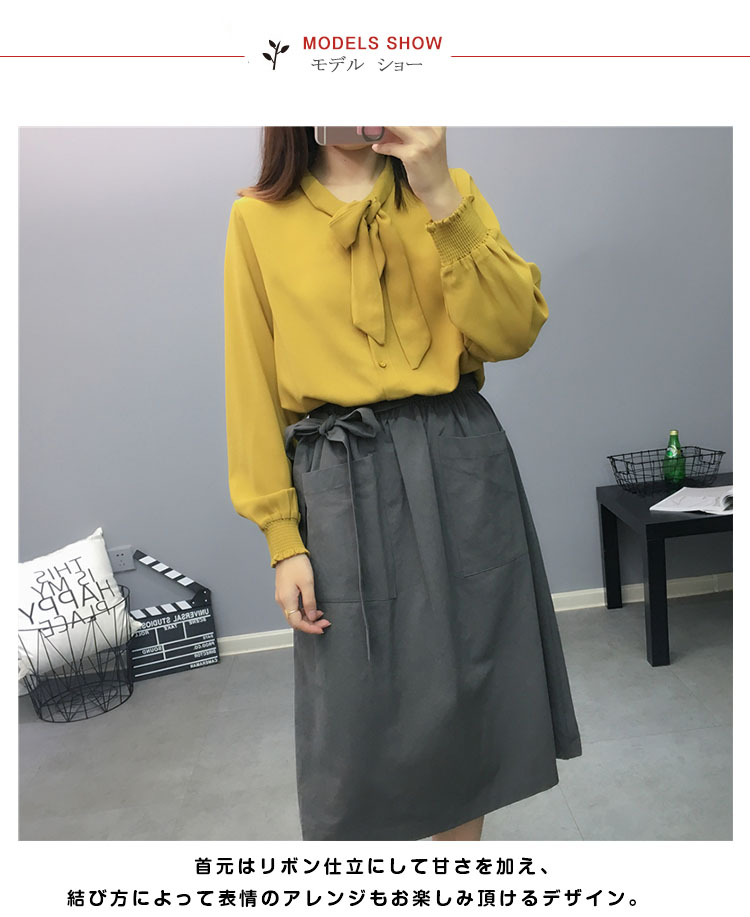 | 大人の可愛さを引き出すボウタイブラウス。さらりと滑らかで、柔らかなシフォン素材。首元はリボン仕立にして甘さを加え、結び方によって表情のアレンジもお楽しみ頂けるデザイン。 | |