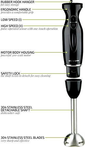 Powered by 300-Watts and a heavy-duty motor, it works quickly and effectively-expertly mixing anything you desire into a smooth, evenly-mixed medley of mouth-watering flavors. Its Slim-Stick design enables this hand blender to fit into any mixing bowl, pot, beaker, or cookware without restriction. It's compact enough to fit anywhere, but powerful enough for the toughest blending jobs. It was also carefully designed to come apart easily so that clean up and storage is no problem. Simply take apart, then hand wash the shaft or place into the dishwasher and let dry. The body can simply be wiped clean with a soft, damp cloth.