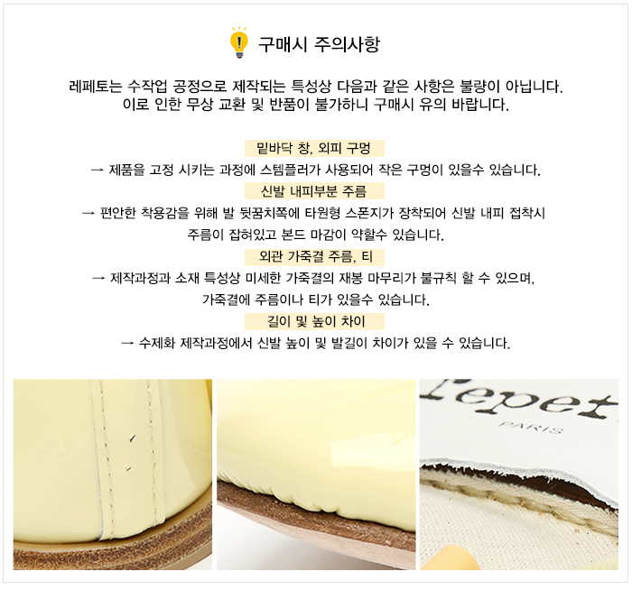| 세탁 방법 | 세탁불가(부드러운 천으로 닦아주세요). 가죽제품의 경우, 사용방법과 환경(습기, 온도, 비, 눈, 빛, 마찰, 체열과 땀)으로 인하여 제품이 이염 및 손상, 변형 될 수 있으니 주의요망. 각 제품 가죽의 손상 및 변형 또는 장식고리 등의 부속품 훼손 및 분실 등은 추가 부속품이 따로 제공되지 않기 때문에 A/S 불가능 할 수 도있습니다. |