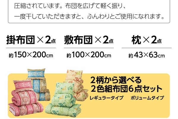 【商品名】2色組布団6点セット 【ボリュームタイプ 掛け布団/敷布団/枕】 抗菌 防臭加工 洗える クラシック柄