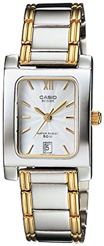 Brand, Seller, or Collection Name:Casio Model number:BEL100SG-7AV Part Number:BEL100SG-7AV Item Shape:rectangle Dial window material type:Mineral Display Type:Analog Clasp:Bangle Case material:Stainless steel Case diameter:21 millimeters Case Thickness:8 millimeters Band Material:Stainless steel Band length:Women's Standard Band width:15 millimeters Band Color:Silver Dial color:White Calendar:Date Special features:measures-seconds Movement:Quartz Water resistant depth:50 Meters