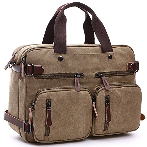 -. Feature : 3-in-1 Multi-Purpose: Briefcase Transforms ,Sleek and versatile design, the bag is convertible for use as briefcase, messenger bag, or backpack depending on need and carrying preference / 90% Canvas with 10% pu leather strap which look more fashionable,Durable and elegant cotton lining,delicated interior pocket for ipad or tablet. / Padded messenger and backpack straps for reduced body stress and comfort wear / Padded compartment protects laptops up to 15.6 inch,Front zippered pockets organizer section / The bag to your preference, perfect for work, school, commutes, travel, trips, and and other day to day activities