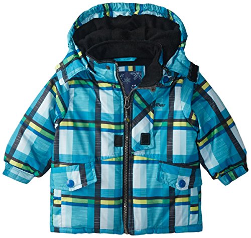 Boy's plaid print snow jacket with polar fleece lining and contrast color elastic Lind hood with Velcro closure.