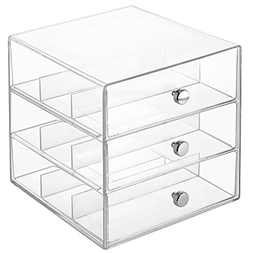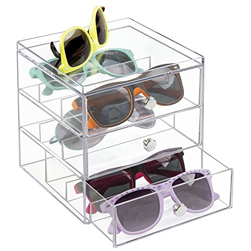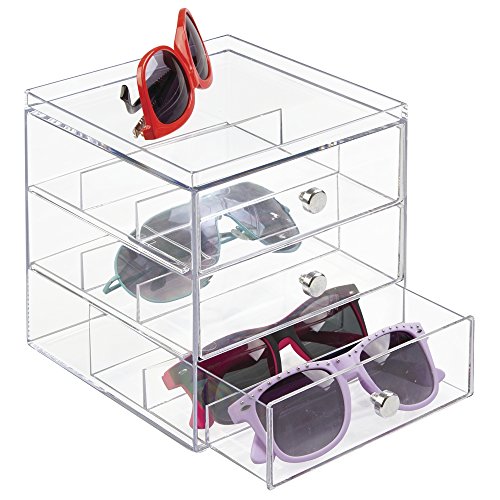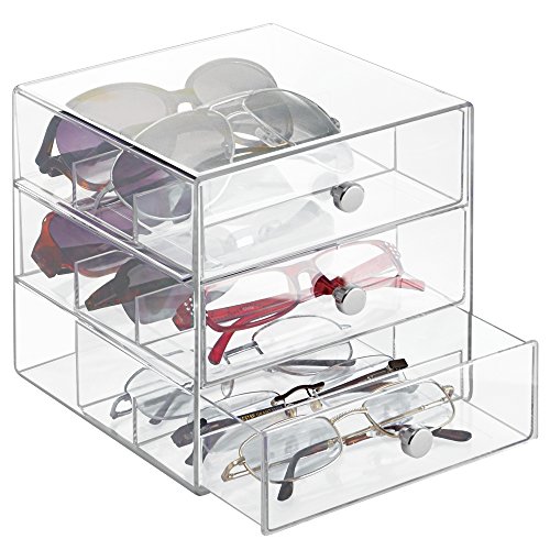 This Eyeglass Organizer is the perfect way to keep your frames conveniently stored. It features 3 drawers with dividers. This organizer is made of durable plastic with easy to pull chrome handles.Feature