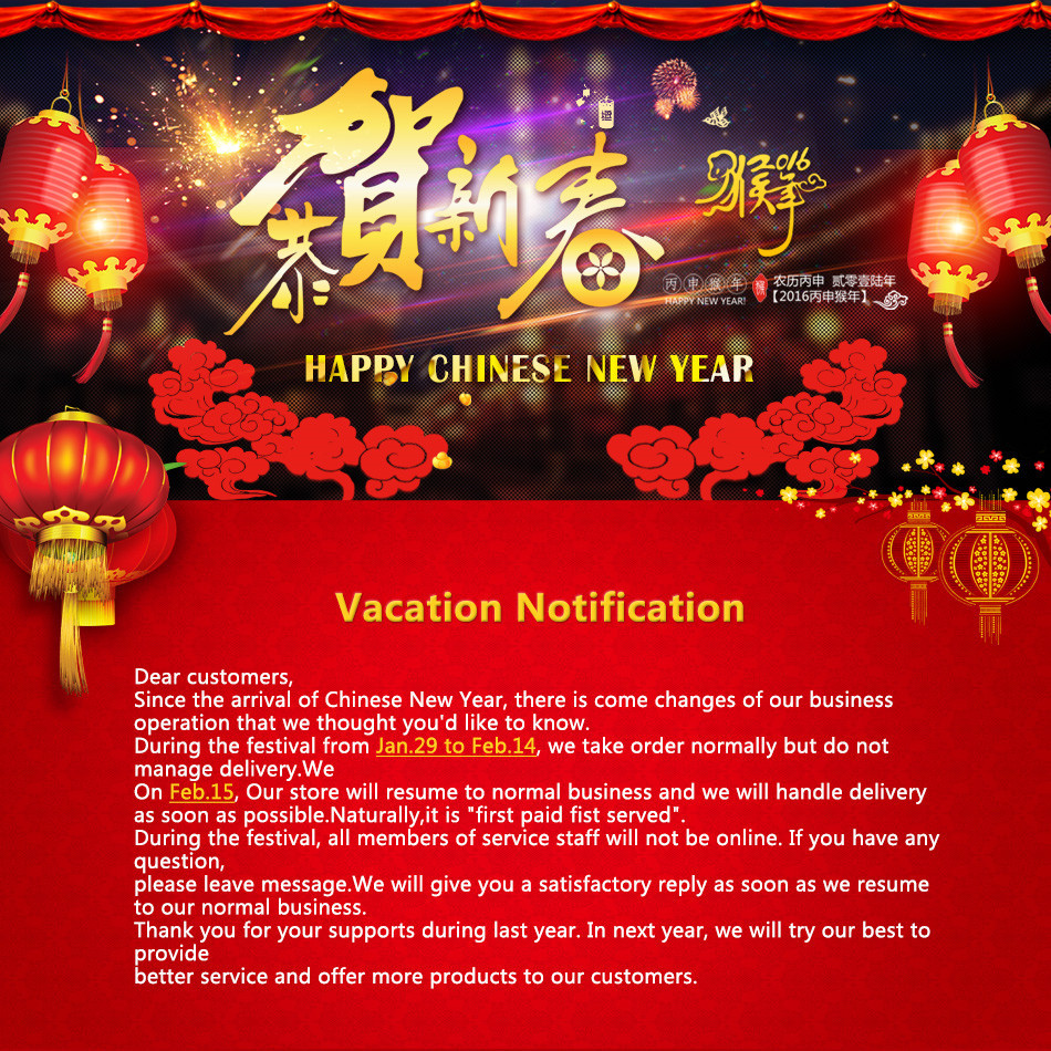 During the festival from Jan.29 to Feb.14, we take order normally but do not manage delivery.We