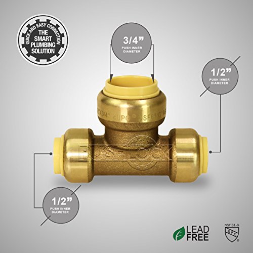 Everflow Pushlock UPET121234 1/2 Inch x 1/2 Inch x 3/4 Inch Long Push Tees Push-Fit Fittings, Made W/ Lead Free DZR Forged Brass, Connect PEX, CPVC & Copper, Pre-Lubricated Quick Installation