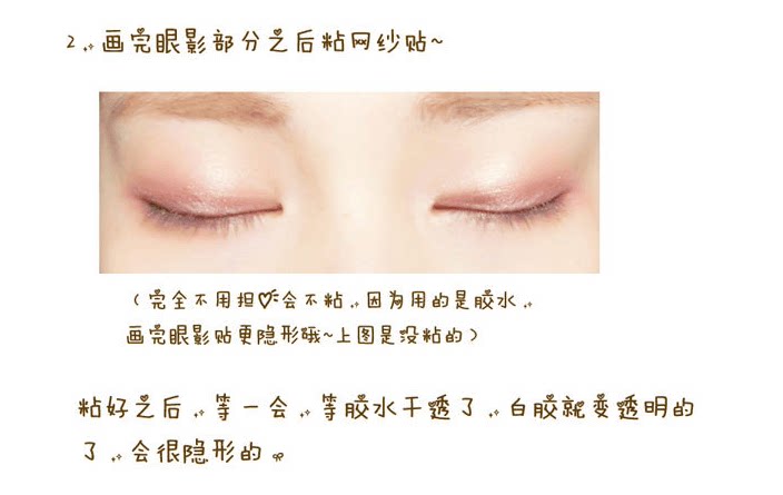 步骤三:等胶水半干的时候,差不多等胶水蘸上15秒左右就可以粘到眼皮上了,找准位置黏上就可以啦,当然要等眼皮贴的胶水干了才可以睁开眼睛哦!这样才有型的.