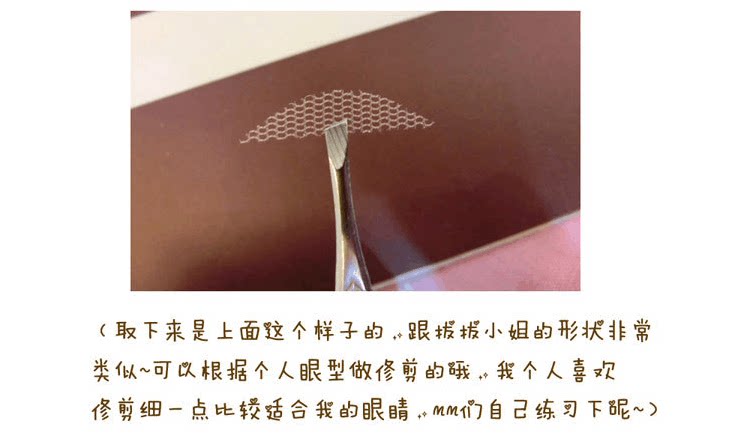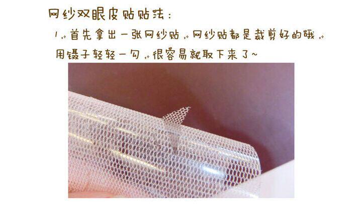 取一片放在手背上,将胶水均匀涂在蕾丝双眼皮上,再用镊子将蕾丝双眼皮贴贴于眼皮上,贴完后要等双眼皮贴干后在睁开眼睛哦