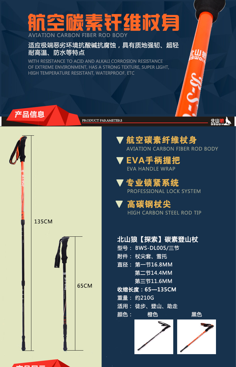 北山狼户外碳素超轻登山杖折叠伸缩拐杖徒步手杖三节直柄旅行爬山