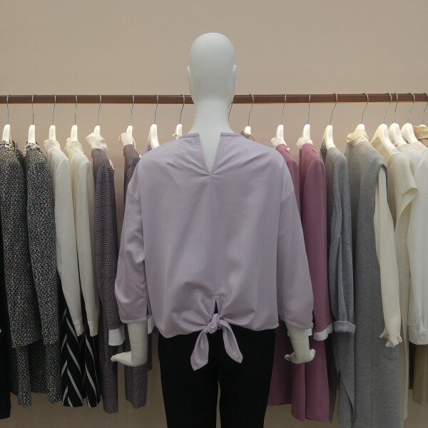 뒷?선의 트임과 밑단 리본묶음처리로 포인트를 준 오버핏의 발랄하면서도 유니크한 블라우스입니다.