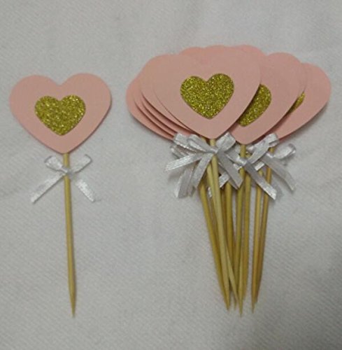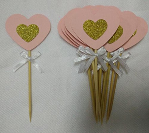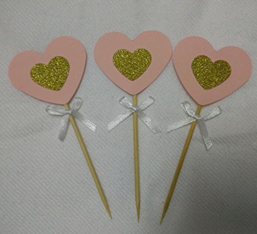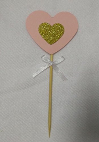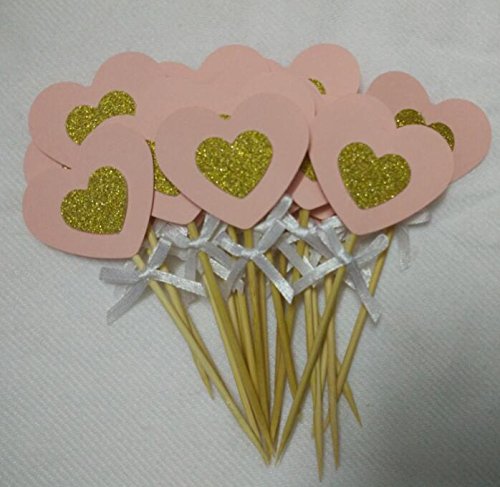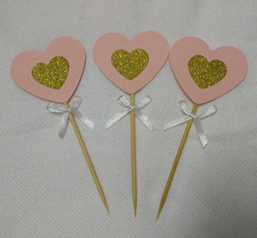 20PCS Pastel Pink and Gold Glitter Love Heart Cupcake Toppers with White Bow for Birthday Parties, Weddings, Bridal, Baby Shower, Valentine's Love Parties