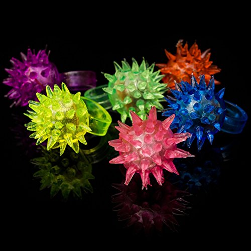 LED rings are a great accessory for any type of celebration. Our LED spike ring is made of a stretchy jelly material and features 3 LEDs (blue, green, and red). To activate, simply press on the ring and it will start flashing. To turn off, press on the ring again. Each box contains 24 rings. Batteries are included and installed! Be sure to check out our matching LED spike necklace and bracelet!