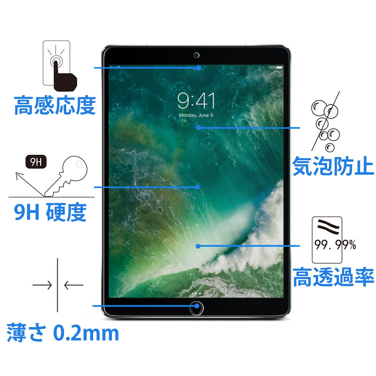 [Hardness 9H] The iPad Pro 12.9 film uses glass of the highest grade strength and the surface hardness is 9H.