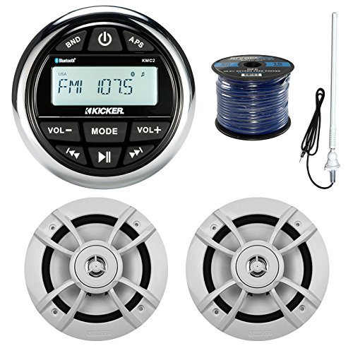 PACKAGE BUNDLE INCLUDES: 1 Kicker KMC2 Gauge Style Am Fm 200 Watt Stereo Media Player = 1 Pair (total of 2) Kenwood KFC-1633MRW 6-1/2-Inch 2-Way Marine Speaker = 1 Enrock 20W 22 Rubber Mast AM/FM Radio Antenna - 1 Enrock 50 Foot 16-Gauge Speaker Wire.
