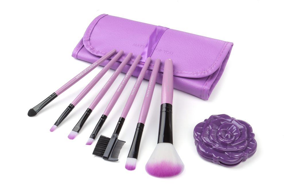 【 9種類 セット 】 アイメイク アップ ブラシ 7本 & ケース & バラ コンパクト 鏡 セット パープルctr-b66【1~2日発送】