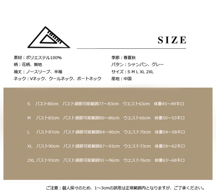ドレス 結婚式 大きいサイズ ドレスワンピース ドレス 結婚式 お呼ばれ パーティードレス フォーマルドレス 二次会 演奏会 20代 30代 40代 2018新作 パーティードレス 結婚式 大きいサイズ お呼ばれ フォーマル商品詳細素材:ポリエステル100%柄:花柄、無地袖丈:ノースリーブ、半袖ネック:Vネック、クールネック、ボートネック季節:春夏秋パタン:シャンパン、グレーサイズ:S M L XL 2XL産地:中国サイズ参照表S バスト80cm バスト調節可能範囲77~83cm ウエスト63cm 体重45~49キロM バスト83cm バスト調節可能範囲80~86cm ウエスト66cm 体重50~53キロL バスト87cm バスト調節可能範囲84~90cm ウエスト70cm 体重54~58キロXL バスト90cm バスト調節可能範囲87~93cm ウエスト73cm 体重59~62キロ2XL バスト93cm バスト調節可能範囲91~96cm ウエスト76cm 体重63~68キロご注意:個人採寸のため、1~3cmの誤差は正常範囲内となりますが、ご了承ください。ドレス 結婚式 大きいサイズ ドレスワンピース ドレス 結婚式 お呼ばれ パーティードレス フォーマルドレス 二次会 演奏会 20代 30代 40代 2018新作 パーティードレス 結婚式 大きいサイズ お呼ばれ フォーマル