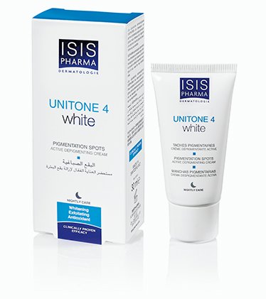 -. Feature : UNITONE 4 white has been specially developed for skin with pigmentation spots. / Apply UNITONE 4 white once a day, only at night on the areas to be treated or as directed by your dermatologist or healthcare professional. UNITONE 4 white is especially formulated for a night application.