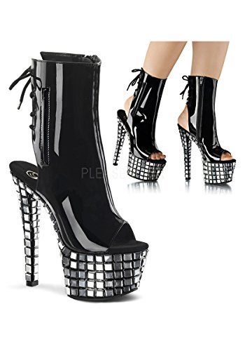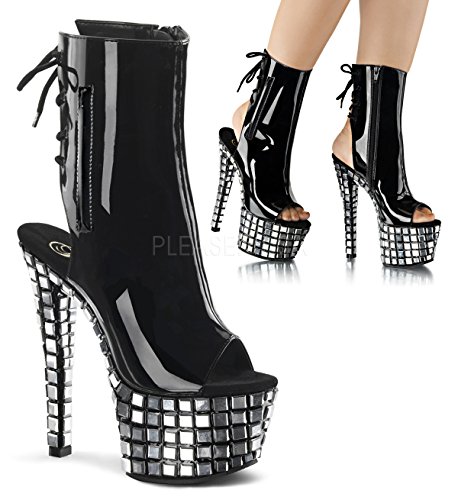 Product DescriptionHeel Height: Approx. 7' Tall. 2 3/4"(7cm) Platform Open Toe. Heel Back Lace-Up Ankle Boot. Featuring Hidden Zip Pocket and Mirror Tiles on Entire Platform Bottom. Inside Zip Closure.0