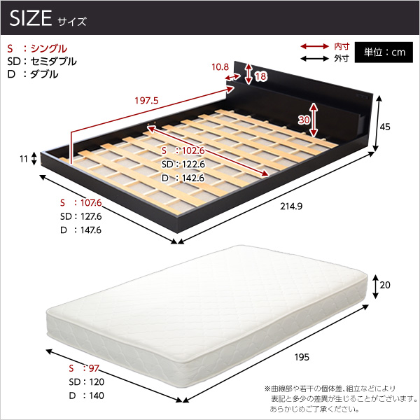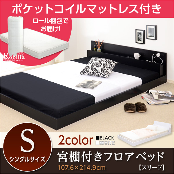 宮棚・コンセント付きフロアローベッド【Slied-スリード-】シングル(ロール梱包のポケットコイルマットレス付き)