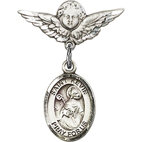 -. Title : Sterling Silver Baby Badge with St. Kevin Charm and Angel w/Wings Badge Pin 7/8 X 3/4 inches