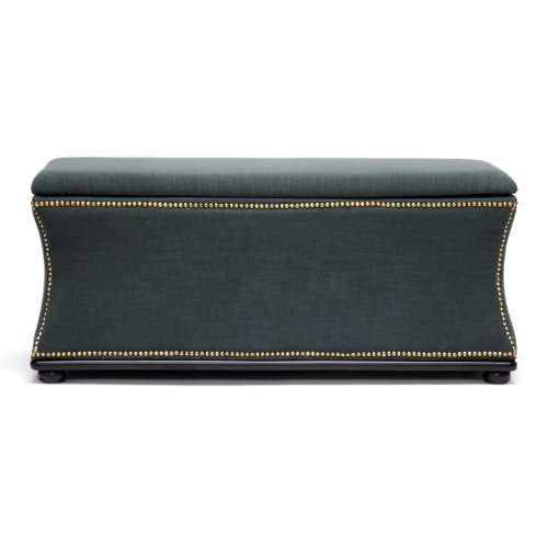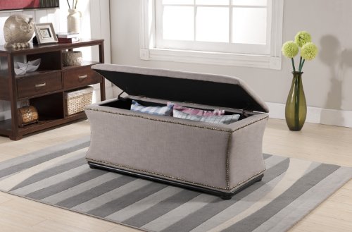 -. Feature : Beige linen with antiqued bronze nail head trim and hidden storage compartment / Eucalyptus wood frame / Polyurethane foam padding / Black wood legs with non-marking feet / Made in China