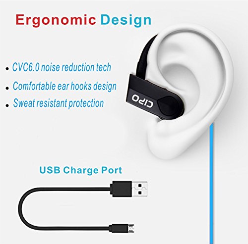 -. Feature : HD STEREO and NOISE CANCELLING: Bluetooth Headphones has the latest Bluetooth 4.1 CSR technology and state of the art acoustic components that produce incredible sound quality with deep bass and crystal clear treble. / LONG BATTERY LIFE: The new and improved lithium polymer battery allows seamless enjoyment of music for up to 8 hours and 240 hours stand-by with a quick charge of only 1.5 hours. / COMFORTABLE AND SECURE FIT WITH IPX-7 WATERPROOF RATING - ActivBuds feature Ergonomically designed flexible ear hooks with gel flex silicone earbuds to ensure your headphones stay comfortably firm in place to guarantee fatigue free ears and tangle free comfort. Great for Running, Jogging, Hiking, Biking, Gym etc. / BLUETOOTH V4.1 WIRELESS TECHNOLOGY: Connect seamlessly with all Bluetooth enabled devices up to 30 feet away. With Noise Suppression technology focus on your favorite music and answer calls without skips or missed words. / WHAT YOU GET:The CIPO bluetooth headphone is covered by 30 days no-questions-asked return policy and 1-Year Manufacturer's Warranty And Replacement .Buy the Wireless earphone worry free today.