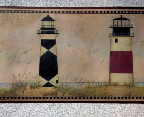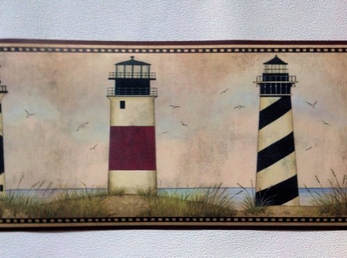 Wallpaper Border Designer Country Lighthouses on Coast with Maroon Trim