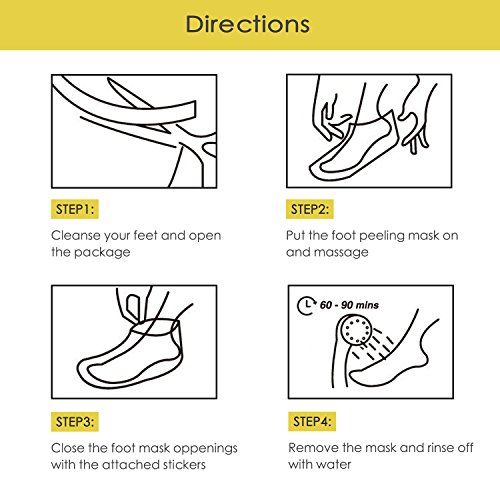 Directions: 1. Cleanse wipe your feet, take out the foot mask and cut open the package. 2. Put the foot peeling masks on, massage your feet so that the essence touches every inch of the skin of your feet. 3. Close the openings around each ankle with the attached stickers, and remove the mask after 60 to 90 minutes and rinse off with water. 4. It's better to do a foot soak after 48 hours. About 20 minutes for each day. Generally speaking, nearly all calluses will be removed within 7-10 days depending on their thickness.