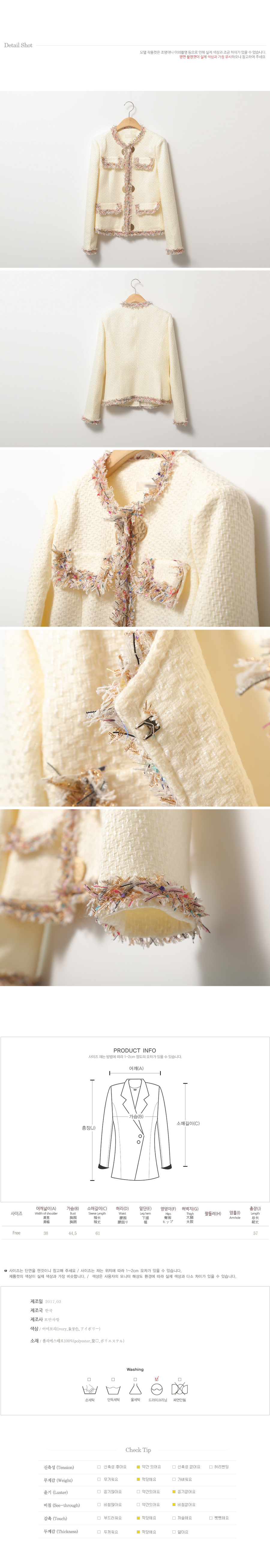 수술 트위드 자켓 [jk5086] 하이퀄리티의 소재와 봉제, 핏 !!페미닌한 무드의 수술 자켓 소개해 드려요 너무 숏하지 않은 적당한 기장감으로 부담없이 즐기기 좋은 아이템! 고급스러운 라인과 끝단 수술 디테일로 멋스럽게 착용하기 좋습니다 프론트 중앙 후크로 손쉽게 오픈 클로징을 도와드리며 후크 부분 골드 장식으로 고급스러움을 더해드렸습니다 캐쥬얼 페미닌등 다양한 스타일링에 포인트가 되어줄 자켓으로 소장가치 충분해요! model 착용 사이즈 : Free(44-66) 세리 모델은 Free 사이즈를 착용했어요~^^44~66까지 무난하게 착용하실 수 있어요. 하이퀼리티 소재의 봉제,핏 자켓으로 추천해드립니다!