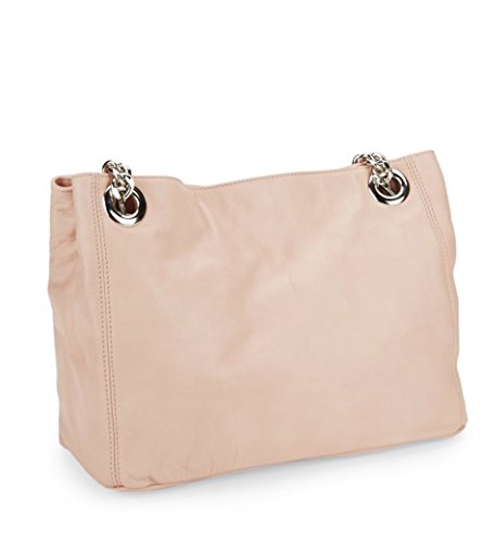 Gold-tone chain accented top handles drop an Italian-leather tote featuring contrast diamond quilt construction with a rose gold-tone logo plate applique.