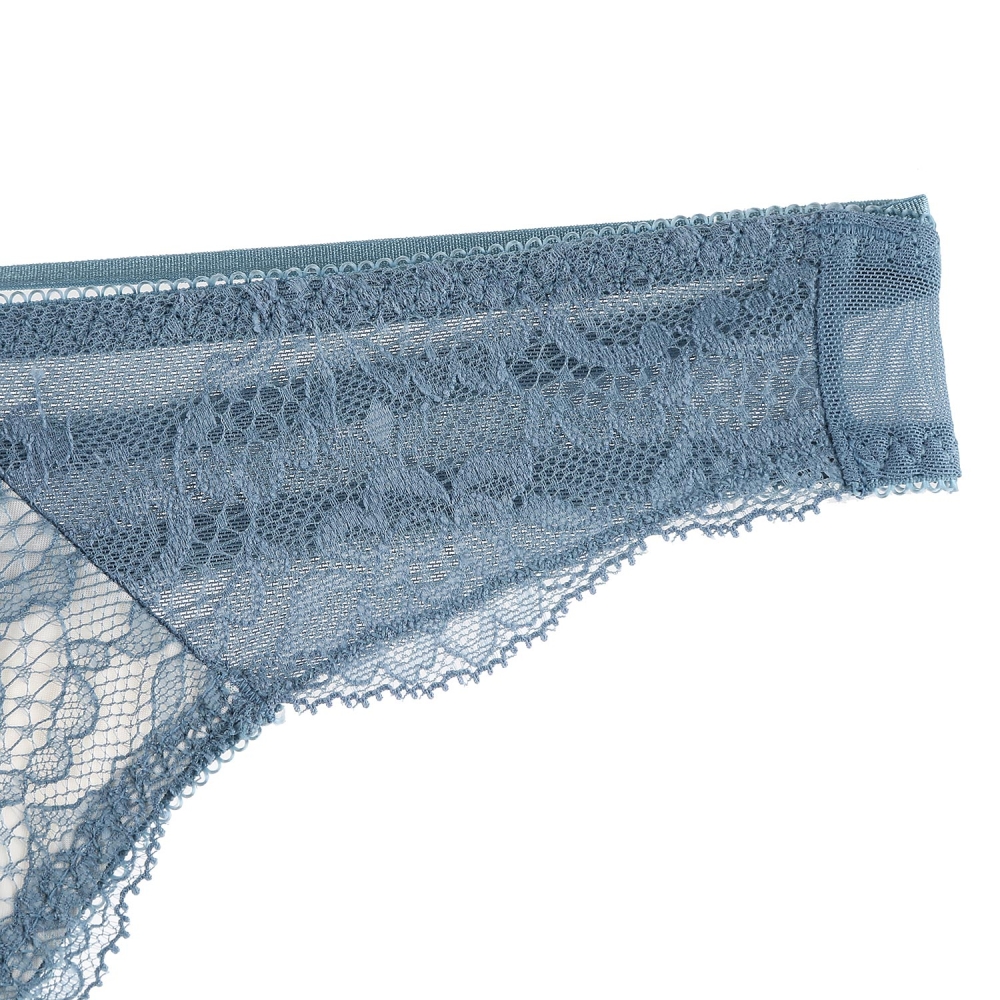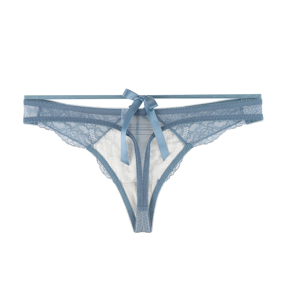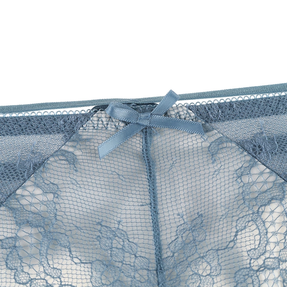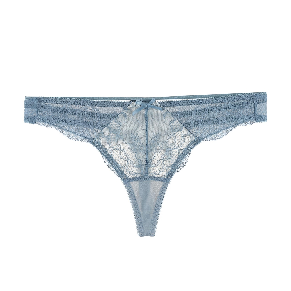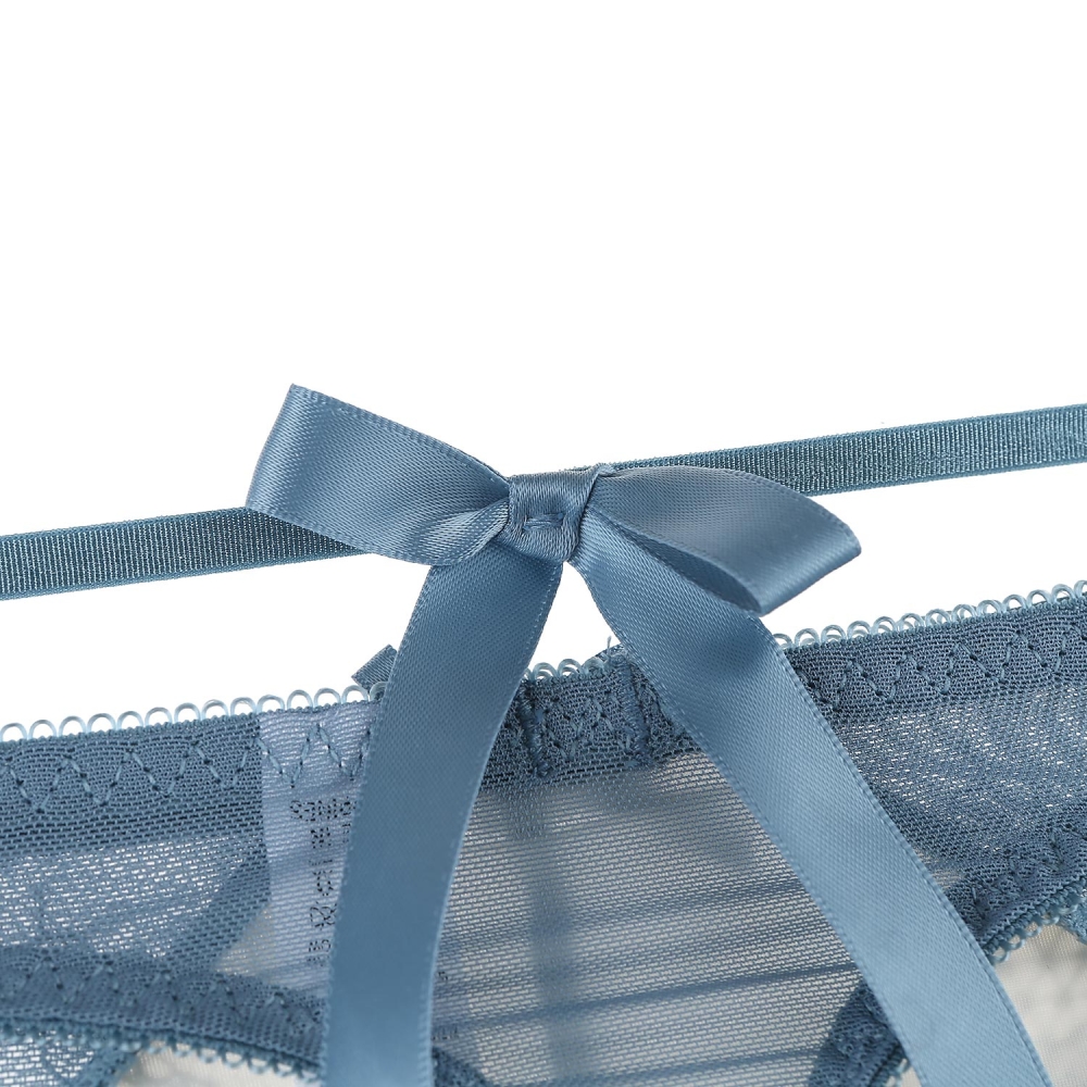 앞판에 절개와 부분의 컬러배색으로 시스루한 효과를 주었고, 뒷판에 PN망과 스트링위에 큰 리본을 달아주어 섹시함을 사랑스럽게 연출.스카이블루의 컬러감과 컬러배색으로 레이스 패턴을 살려주어 화사하면서 러블리한 스타일의 제품.