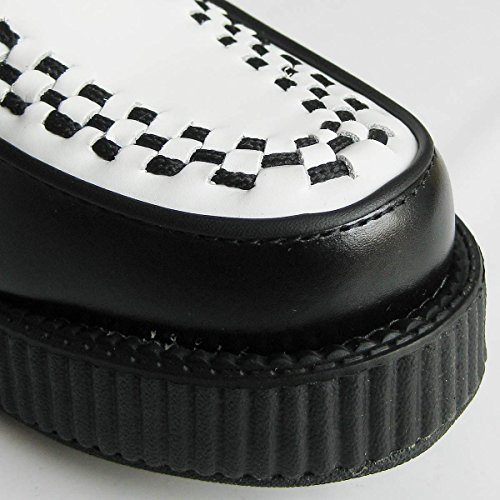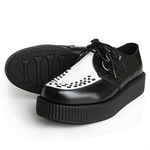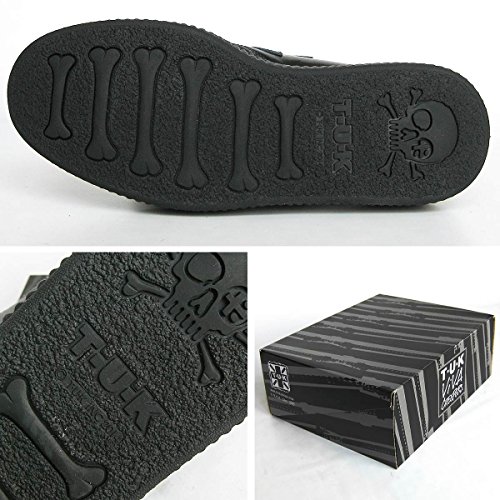 -. Feature : イギリス生まれのカリフォルニア育ちのシューズブランド、「TUK(ティーユーケー)」。GREEN DAY(グリーンデイ)、ブライアンセッツァー、NOFX、U2、SUM41、レディー・ガガ、マイリーサイラス、カーリー・レイ・ジェプセンなど有名ミュージシャンも多数愛用の人気ブランドです。 / 従来の「LOW ROUND CREEPER」で使用されていたTPRソールから、より軽くて減りの少ないVIVAソールに変更されております。見ためはそのままに約2~3割程度軽量化されており、靴底のパターンがスカルボーン仕様になっております。 / ソール高が約4cmタイプ(小さいサイズは約3.5cm)のラバーソール、靴紐を通す金具は大きめのDリングを採用、その横に配置されたTUKブランドロゴがさりげなくおしゃれ! / ハーフサイズの展開はありませんので、特に足幅が狭かったり甲低でなければ、繰り上げ(26.5cm→27.0cm)で宜しいかと思います。