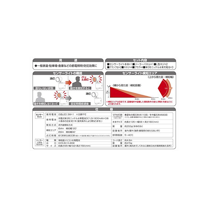 세트 내용:3W센서 라이트 본체×1,솔라 패널×1,단3 형니켈 수소 충전지×3,클램프대×2,L형 나사×2,목나사×4,플러그×4