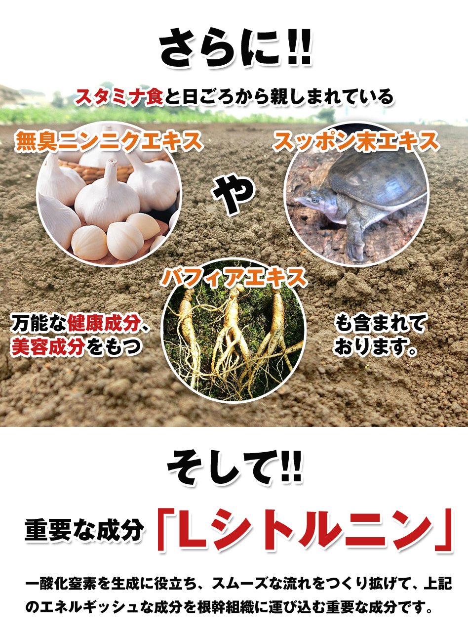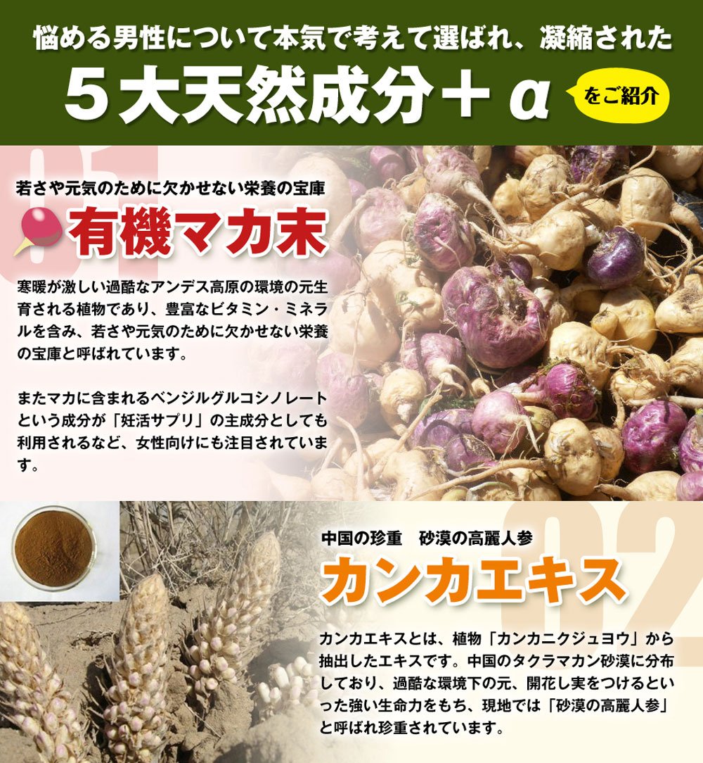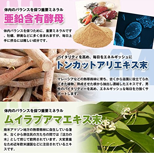 ・原材料・成分 デキストリン マカ カンカエキス 亜鉛含有 スッポン末 L-シトルニン 鉄含有 高麗ニンジン末 ニンニクエキス末 トンカットアリエキス末 セルロース ステアリン酸Ca など・内容量 90粒/1箱 約1ヵ月分となっております。