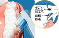 「超極細毛」の長い毛先が歯周ポケットにかくれた歯垢をかき出し、毛先の角をとった「エッジ加工毛」が、歯の表面にこびりついた汚れまできれいに落とす。2種類の毛先を使うことにより、歯についた歯垢を落とすことができる