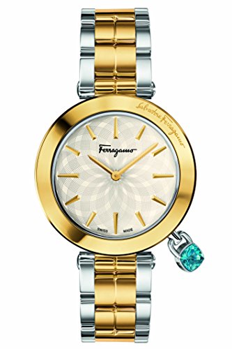 -. Binding : Watch -. Brand : Salvatore Ferragamo -. Department : womens -. EAN : 7630030504679 -. Feature : Ronda 782.6 Swiss quartz movement; yellow gold ion-plated stainless steel case / Interchangeable top ring with logo or blue enameled; charm with blue topaz at 4 o'clock; two tone stainless steel bracelet / Quartz Movement / Case Diameter: 36mm / Water Resistant To 165 Feet -. Label : First SBF Holding Inc. -. Manufacturer : First SBF Holding Inc. -. Model : FIC040015 -. MPN : FIC040015 -. PackageQuantity : 1 -. PartNumber : FIC040015 -. ProductGroup : Watch -. ProductTypeName : WATCH -. Publisher : First SBF Holding Inc. -. Studio : First SBF Holding Inc. -. Title : Salvatore Ferragamo Women's FIC040015 Intreccio Analog Display Quartz Two Tone Watch