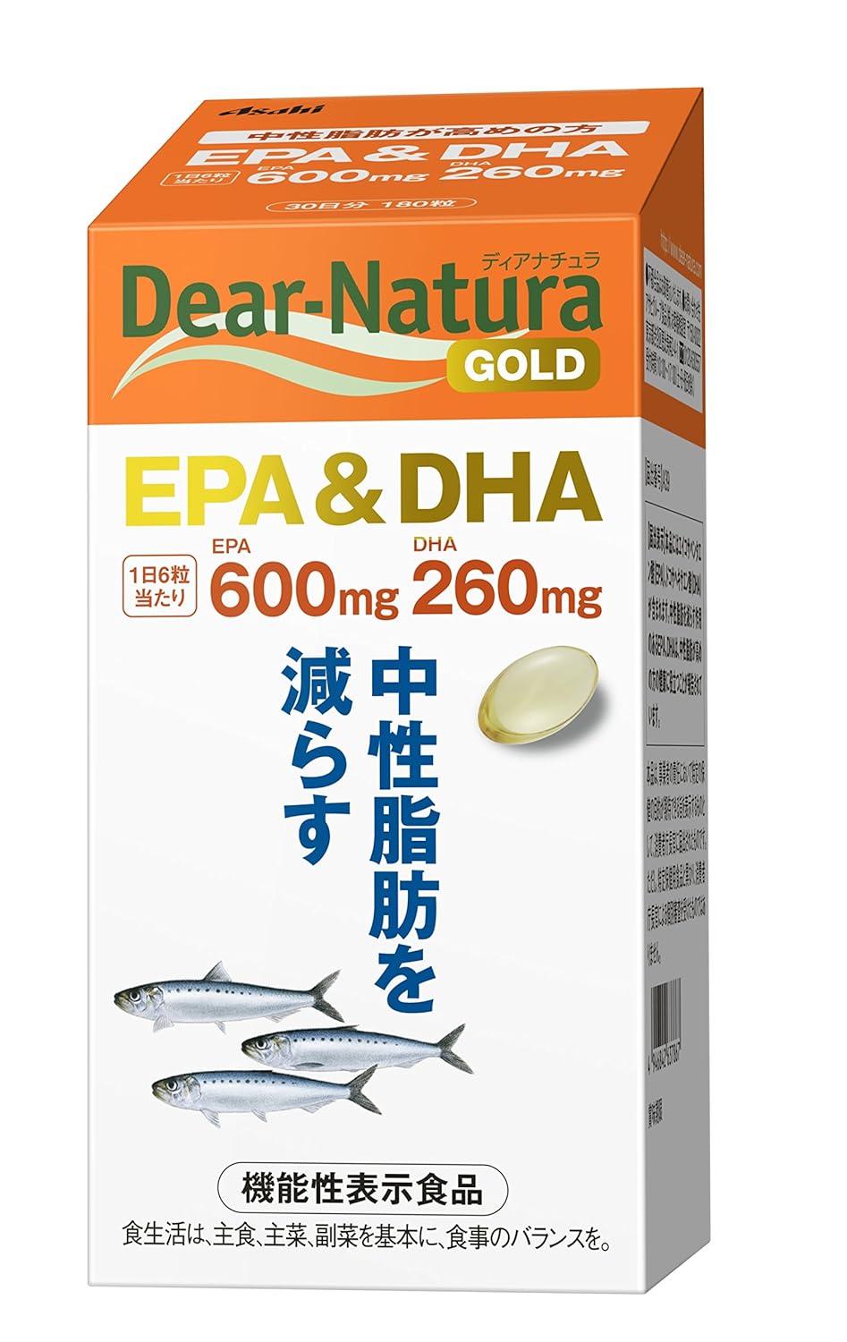 【1日6粒(3648mg)当たり】エネルギー:26.54kcaL、たんぱく質:0.92g、脂質:2.46g、炭水化物:0.18g、食塩相当量:0g (機能性関与成分)EPA:600mg、DHA:260mg