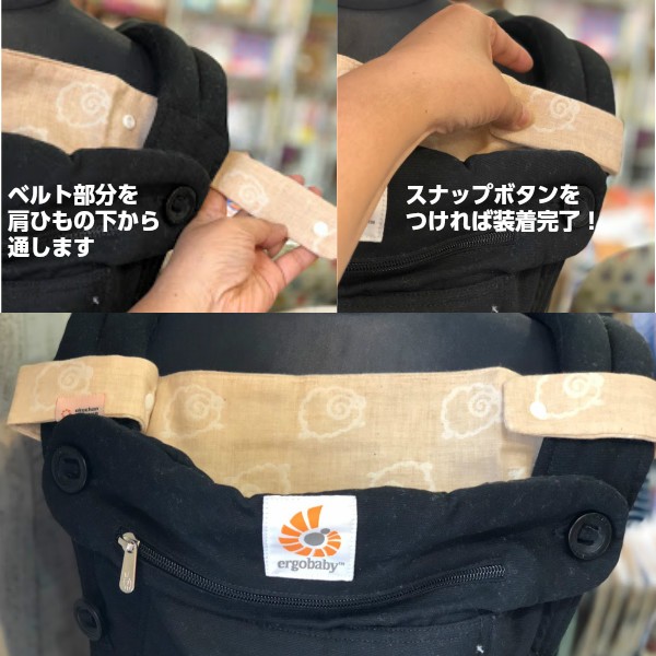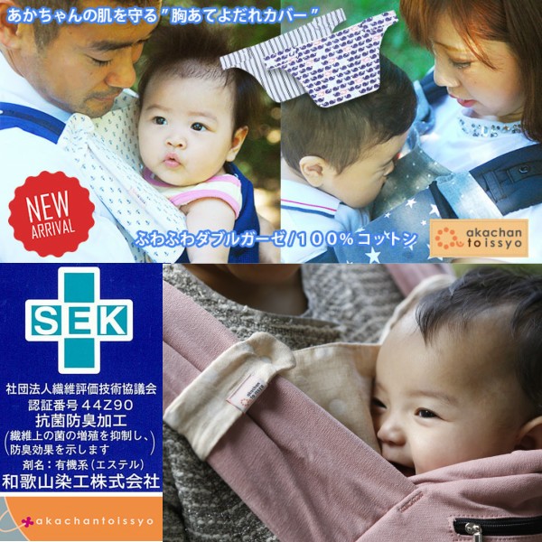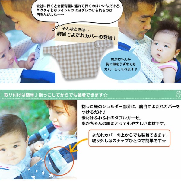 ラメのついたブラウスのとき…ちょっとおしゃれな服のとき…通勤のワイシャツのとき…あかちゃんが胸に顔をこすり付けると、自分の服も赤ちゃんのお肌も心配…そんな時とっても便利な「胸あてよだれカバー」です☆いろんなおんぶ紐にワンタッチで装着できる☆【素材】綿100% ダブルガーゼ【製造】日本【入数】1枚入り